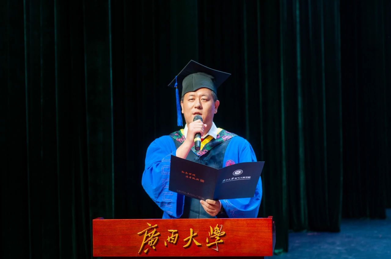 党委书记梁志坚深情寄语2023届毕业生:蓄能发光,扬帆远航。梁志坚就“今后同学们如何更好蓄能发光”同大家分享了自己的看法。首先,要做到蓄能发光,需要同学们以担当奉献成为做人信念,自觉目光多看国家之需,找到努力的方向,做出自己的奉献;其次,要做到蓄能发光,需要同学们以求实创新当作为学追求,面向国家“双碳”战略和建设“壮美广西”的迫切需求,立足岗位,创新创造,以奋进开拓的本色为国家科技自立自强放射出更多光芒;最后,要做到蓄能发光,需要同学们脚踏实地擦亮干事底色,实干苦干才能通达前端,点亮自己,温暖他人,才能在推动时代进步的能量网中传递人生价值的有功功率,作为电气人只要心系家国,眼里才有光,勤恳务实,脚下才有力量。