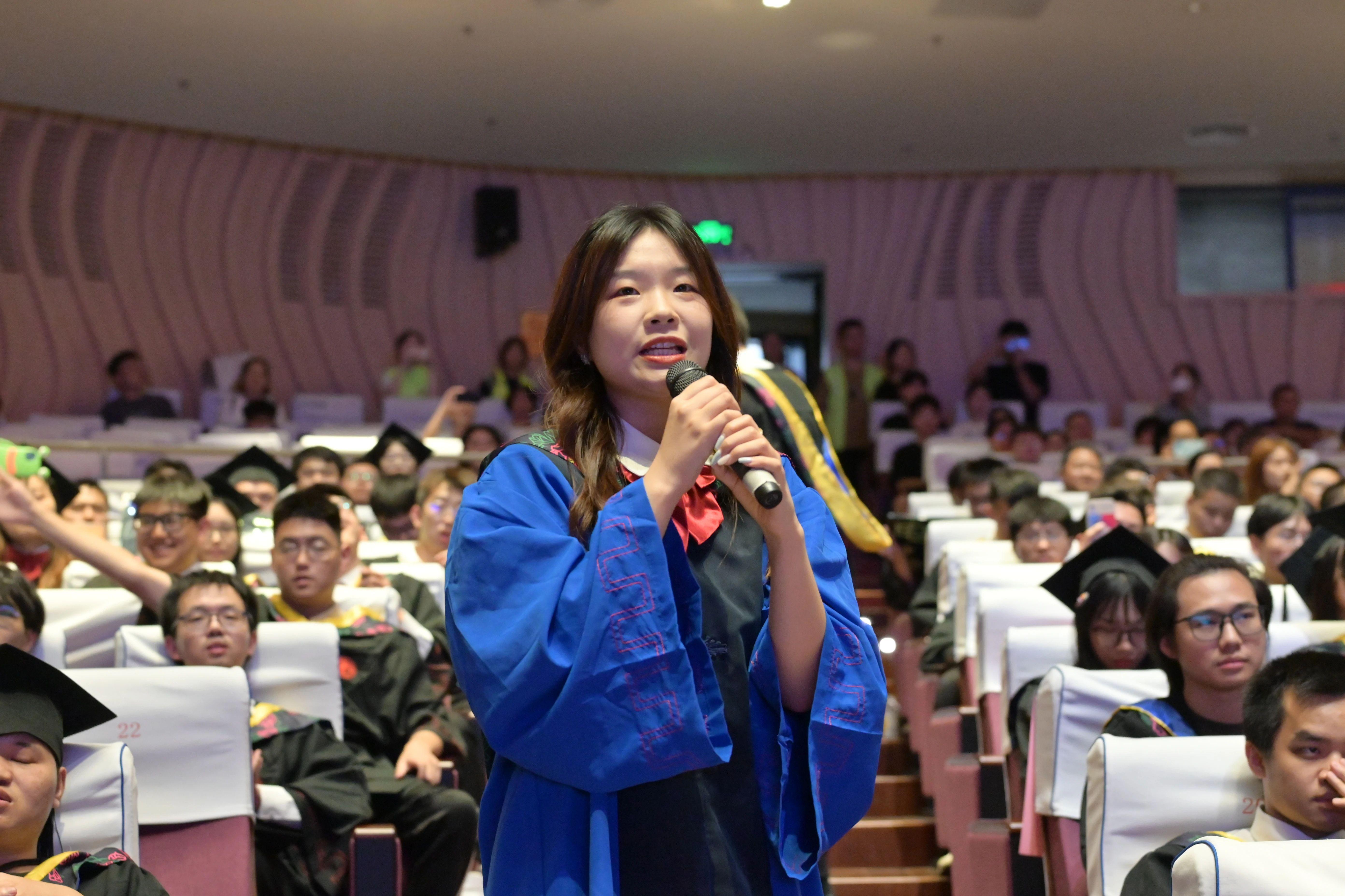 电气工程及其自动化191班黄骞作为本科优秀毕业生代表发言,她回顾在学校备战课程考试、潜心探索科研、投身学生工作与社团活动的四年大学时光,收获了成长、责任和担当,并表示将坚韧不拔、团结勇敢地迎接挑战,在为人民服务的事业中尽情释放自己的青春。
