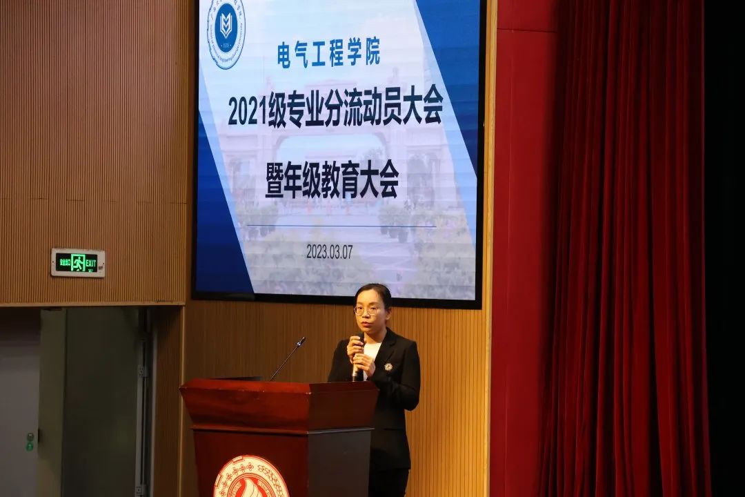 蒋冬连老师以“走在毕业就业的路上”为主题,对2021级前四学期学业进行分析,表扬了取得好成绩的班级和个人,指出了挂科对毕业就业的影响。面对专业分流,蒋老师从工作、岗位、专业发展方向等方面对电气工程及其自动化和自动化两个专业分流方向的优劣势进行对比分析,从专业适用性上对考公务员、读研、就业等选择进行剖析,为同学们选择专业提供了信息支持。