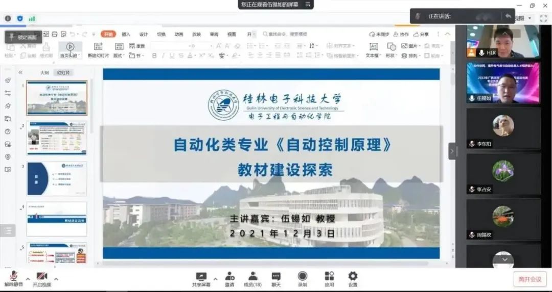 桂林电子科技大学电子信息与自动化学院教师黄新做了题为《电子测量与仪器教材》的报告;桂林电子科技大学电子信息与自动化学院副院长伍锡如教授又分享了题为“自动化类专业《自动控制原理》教材建设探索”的报告。