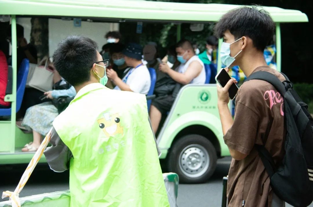 这里有身穿荧光绿志愿服、戴着口罩的志愿者,他们协助新生有序顺利完成报到流程。他们热情接过新生手中的行囊,引导每一位新生到相应的报到点办理手续。