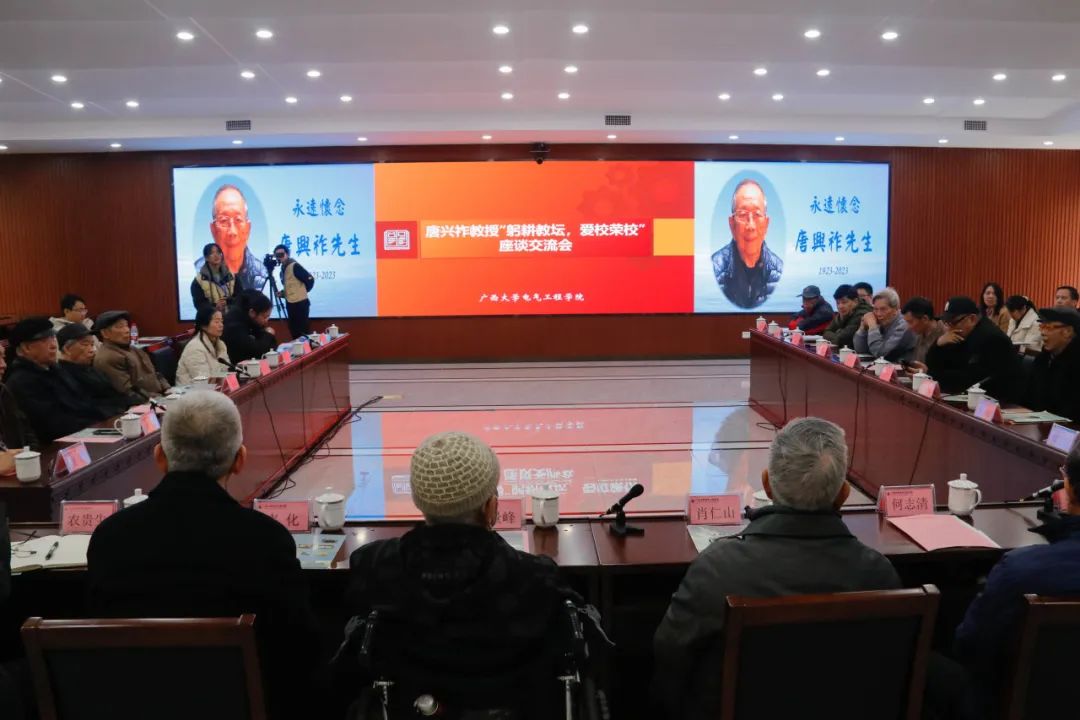 在座谈进行中,学院74级校友,原广西科协党组书记甘向群同志因故不能与会,委托学院领导宣读了他写给唐教授的感恩肺腑之言;播放了华中科技大学退休老教师陈德树教授和浙江大学电气学院的周浩教授发来视频,讲述他们各自与唐兴祚教授在工作中交往的经历,并表达了对唐教授深切的缅怀。